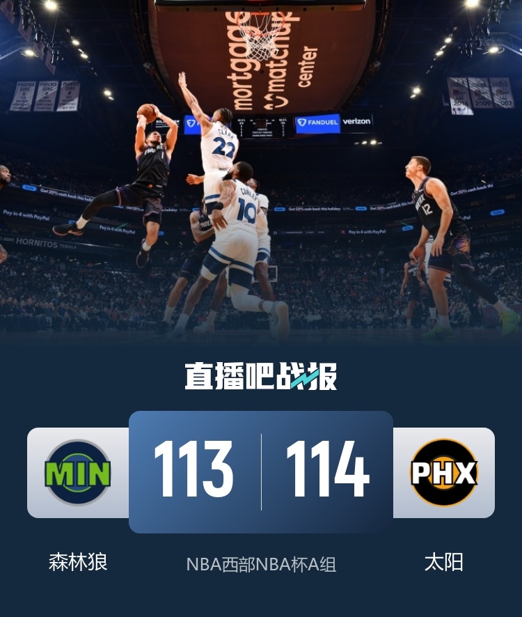 11月22日讯 NBA杯赛A组开打,西部第七的太阳坐镇主场迎战西部第六的森林狼。
