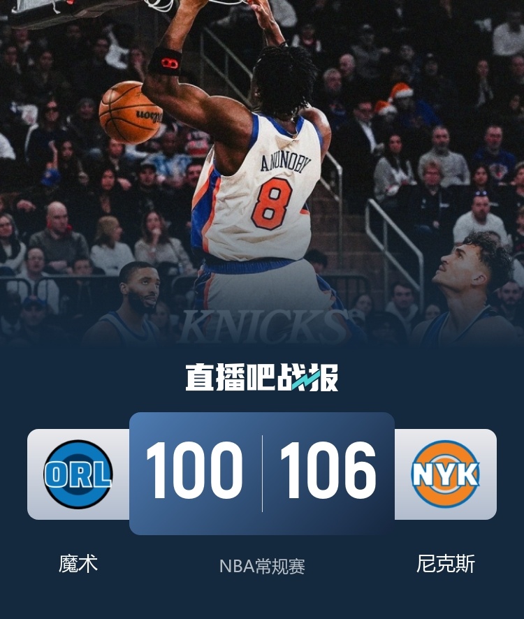 12月8日讯 NBA常规赛继续进行,尼克斯坐镇主场迎战魔术,此前尼克斯15胜7负位列东部第二,魔术则是14胜9负排名东部第五,此役唐斯缺阵。